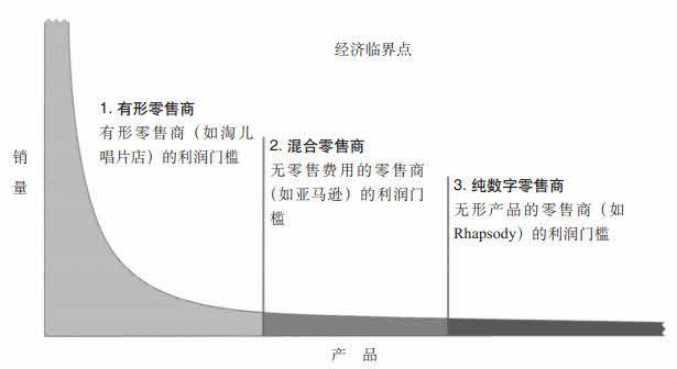 在纯数字模式下,每一种产品都只是数据库中的一个条目而已,实际上没有任何存储成本。传输成本只是宽带字节——这种东西可以大批量购买,价格也正迅速降低,而且仅在产品已被订购的情况下才需使用。再者,纯数字零售商可以在两种模式中做出选择:第一是将产品当成独立个体出售(就像99美分下载一曲的iTunes),第二是提供整体服务(就像Rhapsody的无限量音乐订阅)。