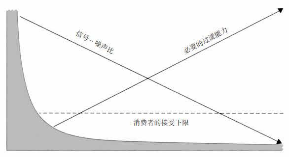 图7-2用另一种方式示意了上述状况。随着尾巴向后延伸,信号-噪声比越来越低。所以,唯有在过滤器变得越来越强大的情况下,信号的质量才能保持不变,继续帮助消费者们找到他们真正想要的东西。